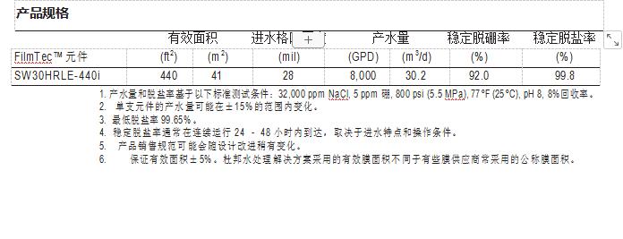 FilmTec™ SW30HRLE-440i 元件有著高脫鹽率和低能耗的組合特點(diǎn),同時(shí)還有著最 高有效膜面積和寬進(jìn)水流道,能夠?yàn)橹械群透叩塞}度進(jìn)水的系統(tǒng)提供可持續(xù)的 低生命周期成本。FilmTec™ SW30HRLE-440i 元件有以下優(yōu)點(diǎn):