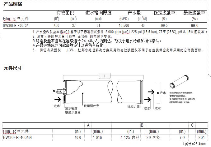 FilmTec™ BW30FR-400/34 是一款適用于處理高污染水源、同時 具有抗污染性、高脫鹽率和高產(chǎn)水量的抗污染膜元件。