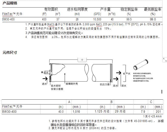 FilmTec™ BW30-400 在要求高品質的產水時是很好的產品選擇。這是市場上第一 款 400 平方英尺的膜元件,繼續被廣泛用于新設備和舊系統改造,尤其系統資 金和生產力是考慮因素時。