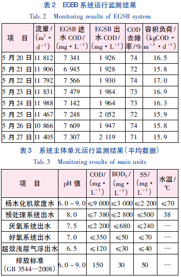 該工藝穩(wěn)定成熟、運行可靠、管理方便,經(jīng)過調(diào)試,系統(tǒng)運行效果良好,各項水質(zhì)達(dá)到標(biāo)準(zhǔn)要求。EGSB 運行數(shù)據(jù)見表2,各主體單元平均運行結(jié)果見表3。