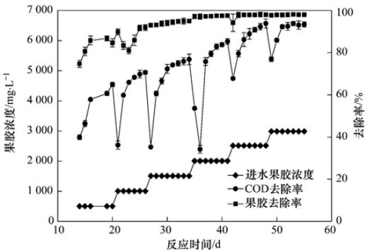 采用人工配水對上述污泥進行馴化, 配水COD為3?000 mg ·L-1左右,接種污泥在以葡萄糖為唯一碳源的培養基中培養13 d后,逐步添加果膠進行馴化,添加量分別為:葡萄糖2?500 mg ·L-1+果膠500 mg ·L-1,7 d; 葡萄糖2?000 mg ·L-1+果膠1?000 mg ·L-1,6 d; 葡萄糖1?500 mg ·L-1+果膠1?500 mg ·L-1,8 d; 葡萄糖1?000 mg ·L-1+果膠2?000 mg ·L-1,7 d; 葡萄糖500 mg ·L-1+果膠2?500 mg ·L-1,7 d; 果膠3?000 mg ·L-1,7 d; 當果膠與COD去除率達到90%以上時,說明馴化成功.
