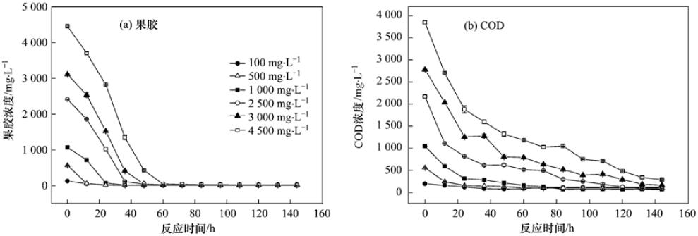 (2)馴化污泥能夠降解初始濃度大于4?500 mg ·L-1的果膠廢水.果膠濃度越高,降解速率越快. 果膠濃度為100和500 mg ·L-1時,果膠降解速率分別為4.5和23.1 mg ·(L ·h)-1,而濃度為2?500和4?500 mg ·L-1的果膠廢水,降解速率分別為49.8和74.0 mg ·(L ·h)-1.果膠初始濃度低于500 mg ·L-1,COD去除率較低,僅為41.6%~82.0%.果膠初始濃度高于1?000 mg ·L-1,COD去除率穩定在91%以上.