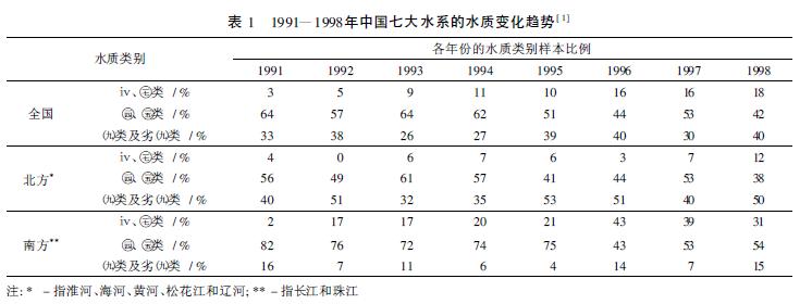 用水逐年增長, 水資源浪費嚴重。據統計, 自1949) 2002年, 全國用水量增加了4 000多億m3,大約每10 年增加1 000 億m3, 年平均增加約為100億m3。1980年以后, 全國總用水量的增長幅度略有下降, 但年平均增長量仍為62億m3 左右。農田灌溉多沿用傳統方式, 灌溉利用系數在0. 45左右, 至少有一半的水被浪費。工業用水利用率也很低, 發達國家的萬元GDP 用水量一般在50 m3,而中國的萬元GDP用水量卻在730 m3。水質不容樂觀, 2006年, 中國廢水排放總量達到536. 8億,t 其中工業廢水為240. 2億,t 占排放總量的44. 7% 。廢水排放居于前四位的行業依次為造紙、化工、電力和紡織, 這四個行業排放的廢水占重點統計企業廢水排放量的53. 9%。表1列出了1991) 1998年中國七大水系的水質變化趨勢。