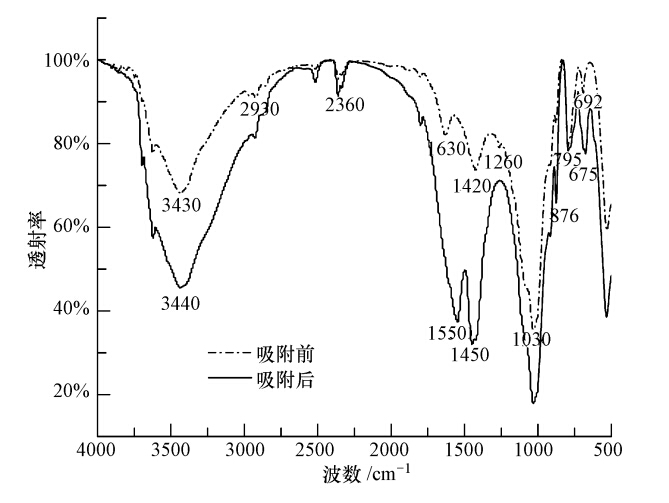 由圖 6可知,濕地基質吸附Cr(Ⅵ)之前在3430 cm-1處存在一個強而寬的譜帶,說明基質表面存在O—H、N—H伸縮振動;2930 cm-1處的吸收峰與—CH2的反對稱伸縮振動相關;2360 cm-1處為空氣中CO2吸收峰;1630 cm-1處的吸收峰與C O伸縮振動相關;1420 cm-1處的吸收峰與羧基中的C O伸縮振動相關;1260 cm-1處的吸收峰與C—O伸縮振動相關;1030 cm-1處有強吸收峰,可能表現為Si—O—Si的對稱伸縮振動;876、795、692 cm-1處的吸收峰與C—H的彎曲振動相關.基質吸附Cr(Ⅵ)后,3430 cm-1處的吸收峰向高波數區移動了10 cm-1,說明羥基和氨基可能參與了Cr的吸附;1420 cm-1處的吸收峰向高波數區移動了30 cm-1并形成強吸收帶,說明羧基可能與Cr(Ⅲ)發生了配位作用;1630 cm-1處的吸收峰向低波數區移動了80 cm-1并形成強吸收帶,同時1260 cm-1處的吸收峰消失,692 cm-1處的吸收峰向低波數區移動了17 cm-1,表明C O、C—O、C—H等基團與Cr的吸附有關.這些結果表明,濕地基質中的有機質作為電子供體參與了Cr(Ⅵ)的還原.