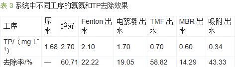 由表3可見,工藝中對TP去除起主要作用的工序是TMF過濾,其去除率約為58%。經(jīng)過MBR和吸附處理后,廢水中TP質(zhì)量濃度小于0.5mg/L,達(dá)到(GB21900—2008)表3標(biāo)準(zhǔn)的要求。