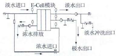 (2)因?yàn)镋DI 模塊系統(tǒng)為直通逆流設(shè)計(jì),即淡水及極水進(jìn)口設(shè)置在模塊底部,出口都設(shè)置在頂部,極水流由淡水流進(jìn)口供給,濃水進(jìn)口設(shè)置在模塊頂部,因此運(yùn)行過(guò)程中,為了防止?jié)馑Z入產(chǎn)品水,通過(guò)控制濃水進(jìn)口閥來(lái)調(diào)節(jié)濃水進(jìn)口與淡水出口之間的壓力差,嚴(yán)格控制淡水產(chǎn)水壓力至少比濃水進(jìn)口壓力大0.035 MPa,EDI 系統(tǒng)示意如圖 3 所示。