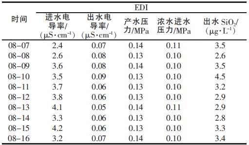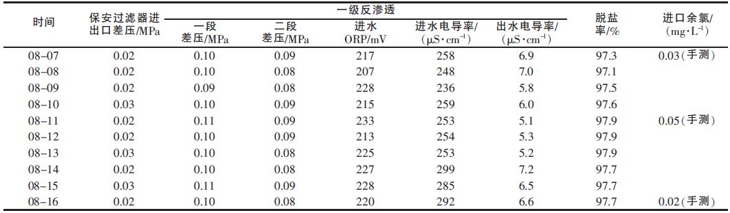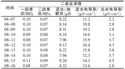 表 2 一級(jí)反滲透運(yùn)行結(jié)果 注:以2012-08-07~2012-08-16 十天運(yùn)行數(shù)據(jù)為例。