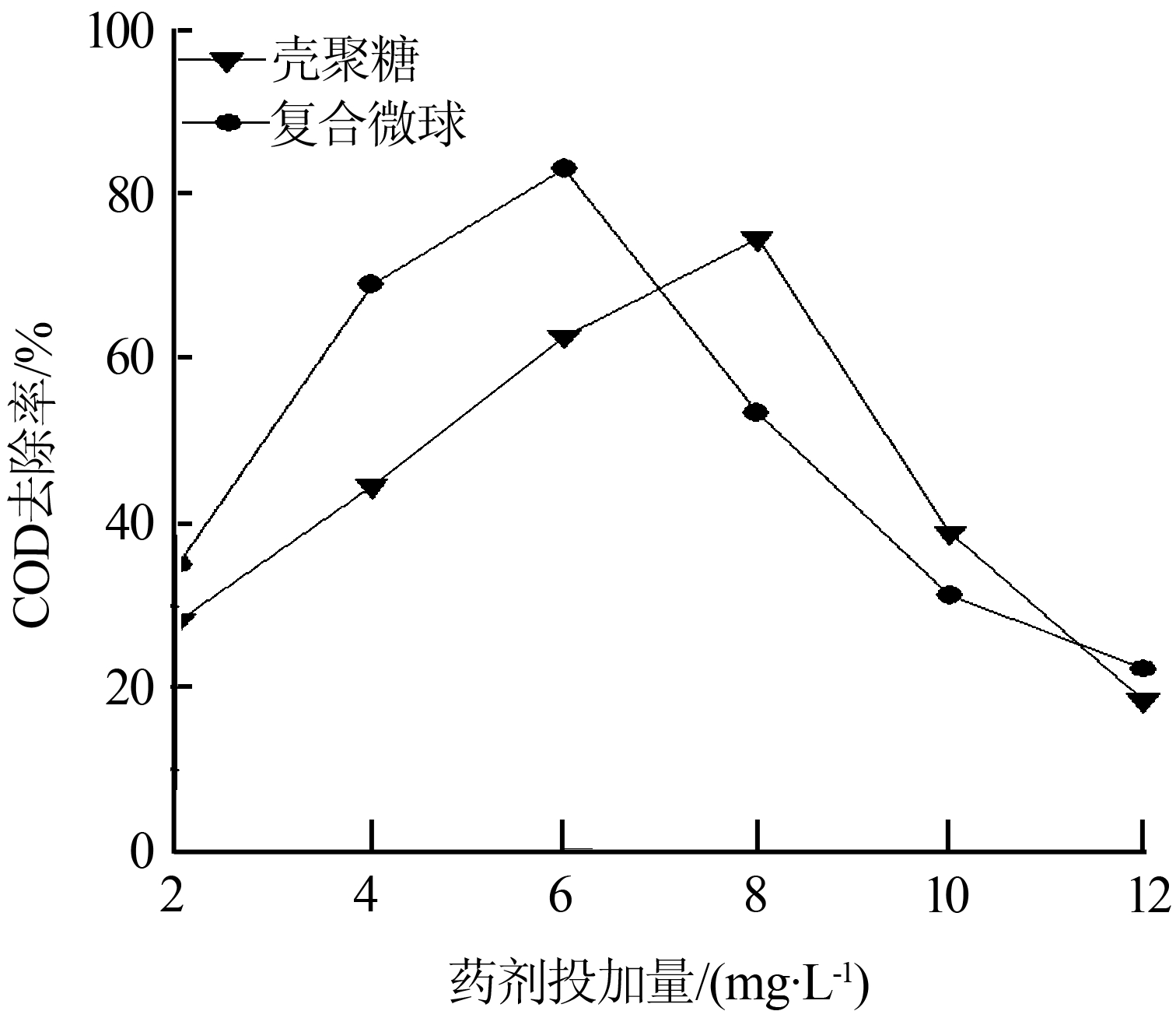 在攪拌速度為120 r/min,復(fù)合微球投加量為6 mg/L(對比實(shí)驗(yàn)殼聚糖投加量為8 mg/L),沉降時間為24 h的條件下,考察了pH對處理效果的影響,結(jié)果如圖 1所示。由圖 1可知,對于單一殼聚糖而言,只在比較適的pH下才能起到比較好的處理效果。而對于復(fù)合微球,pH對處理效果的影響較小,在pH 為4~9的范圍內(nèi)COD去除率均在75%左右。復(fù)合微球在其分子結(jié)構(gòu)上具有殼聚糖本身所擁有的羥基、氨基等活性基團(tuán),同時具有交聯(lián)劑帶來的羧甲基活性基團(tuán),所以在酸性或堿性條件下均可以在一定程度上接受和供給H+,進(jìn)而起到穩(wěn)定的絮凝的作用。