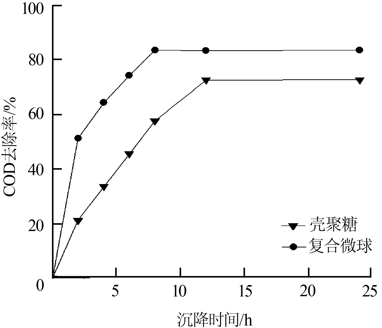在pH為8,攪拌速度為120 r/min,復(fù)合微球投加量為6 mg/L(對比實(shí)驗(yàn)殼聚糖投加量為8 mg/L)的條件下,考察了沉降時間對處理效果的影響,結(jié)果如圖 4所示。