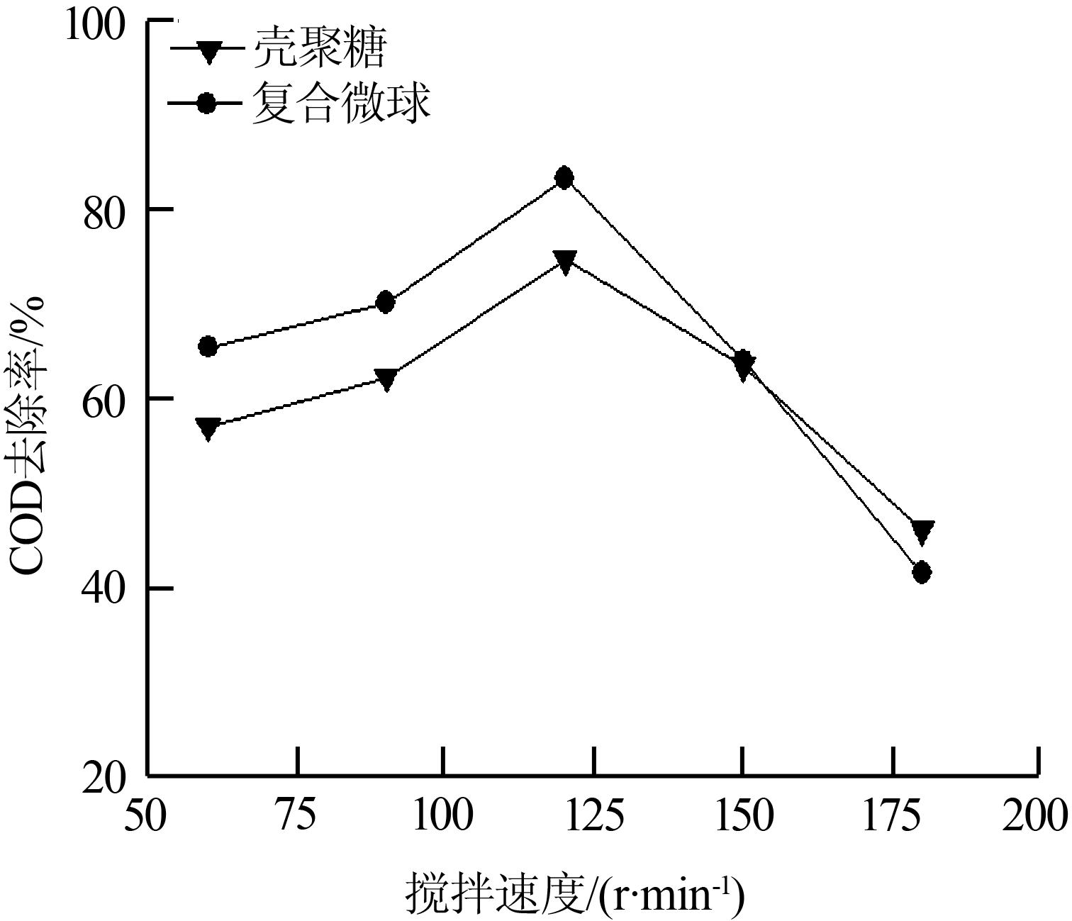 在pH為8,復(fù)合微球投加量為6 mg/L(對比實(shí)驗(yàn)殼聚糖投加量為8 mg/L),沉降時間為24 h的條件下,考察了攪拌速度對處理效果的影響,結(jié)果如圖 3所示。
