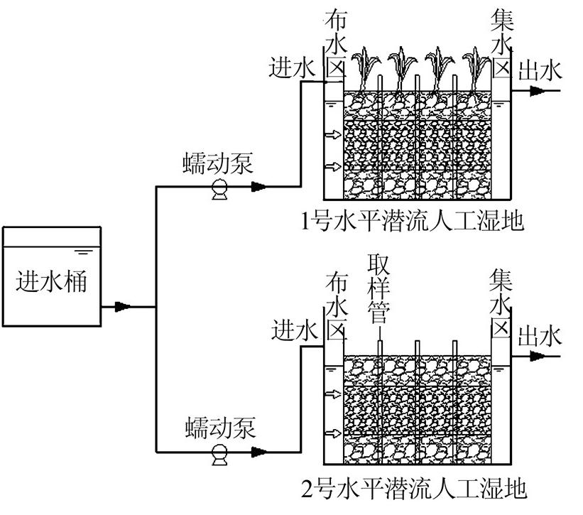 于西安建筑科技大學校內(nèi)構(gòu)建2組結(jié)構(gòu)相同的由有機玻璃構(gòu)成的水平潛流人工濕地(尺寸均為0.75 m×0.4 m×0.8 m)。為了獲得較好的水力性能和處理效果,實驗采用了不同粒徑的填料組成,其礫石粒徑配比從下到上為15 cm大粒徑(d:15~30 mm)、25 cm小粒徑(d:5~15 mm)、15 cm大粒徑(d:15~30 mm),基質(zhì)孔隙率為50%。1號濕地為種植蘆葦?shù)乃綕摿鳚竦兀N植密度為13株/m2,2號濕地為未種植植物的空白水平潛流濕地。礫石、蘆葦均取自西安皂河附近。