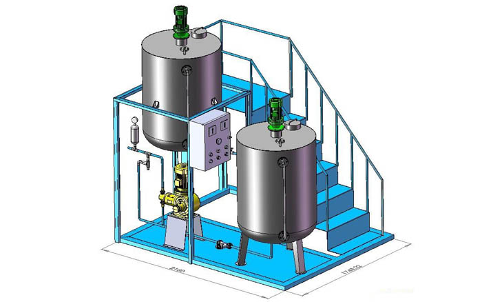 本裝置主要包括藥液計量泵系統、溶配系統、計量投加系統、安全系統和控制系統等五部分。