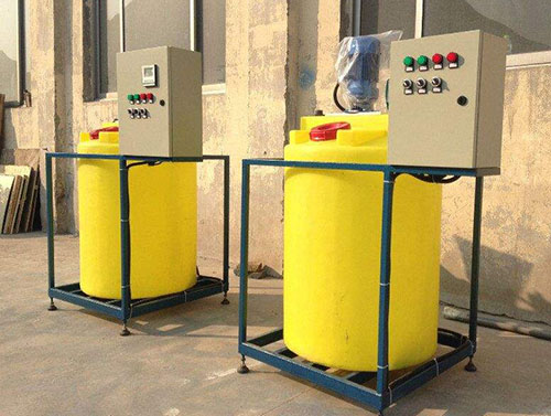 固體藥劑加入溶藥箱內然后按比例加入工業水攪拌溶解,由計量投加系統投加藥點。投加控制可