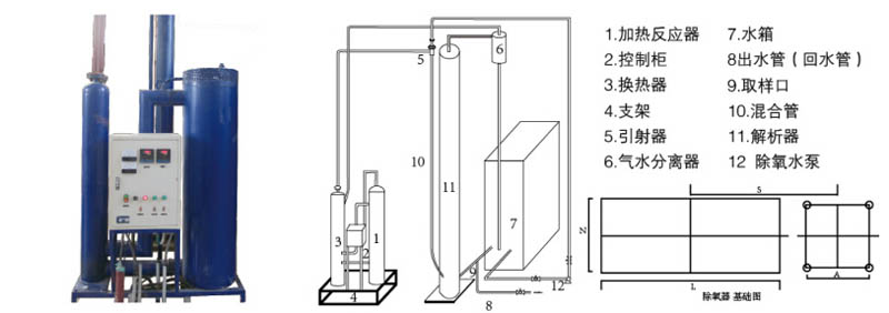 由于設(shè)備結(jié)構(gòu)簡(jiǎn)單,所以在設(shè)計(jì)和安裝方面沒(méi)有特別嚴(yán)格的要求,下列幾點(diǎn)在必要時(shí)可據(jù)具體情況進(jìn)行不同程度的改動(dòng)1、設(shè)備只需單地基,建議解吸器底部預(yù)埋鋼板,安裝時(shí)現(xiàn)場(chǎng)焊接;反應(yīng)器底部只需水平; 2、設(shè)備距墻不少于30cm,設(shè)備的相對(duì)位置可根據(jù)具體情況有一些變動(dòng);3、在設(shè)備附近的墻上安置配電柜,功率因設(shè)備型號(hào)而異; 4、按流程根據(jù)現(xiàn)場(chǎng)條件將設(shè)備就位, 應(yīng)注意保持解吸器頂部高于水箱最高水位2米以上;5、建議除氧泵揚(yáng)程45~50米;除氧泵流量應(yīng)為設(shè)備出力的1.25~1.5倍(型號(hào)參見(jiàn)表四);6、按流程將設(shè)備連接起來(lái),接口除特定指明外以焊接為佳;設(shè)備及各管路應(yīng)無(wú)泄漏; 7、在保證流程合理的前提下,設(shè)備可靈活布置,建議靠墻或邊角布置;8、設(shè)備布置困難時(shí),可將引射器、解吸器氣水分離器與換熱器、加熱反應(yīng)器、電控柜分開(kāi)布置(如分置于室內(nèi)外、分置于不同樓層等);9、若用戶需要有專用的密閉除氧水箱,可根據(jù)附圖進(jìn)行連接.