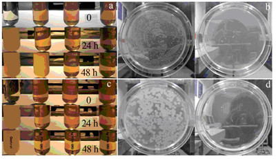 圖 4 Ag-PDA-石墨烯復(fù)合粒子對E.coil (a,b)和B.subtilis (c,d)的抗菌效果