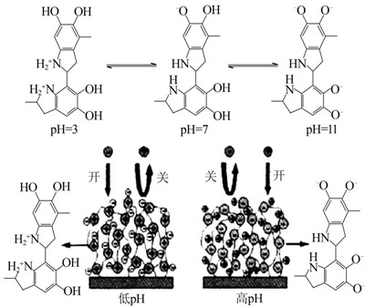 多巴胺(dopamine),一種生物神經(jīng)遞質(zhì)。2007年,H. Lee等〔2〕從貽貝的黏附蛋白中獲得啟發(fā),利用多巴胺研究了其在不同有機、無機材料表面的自聚涂覆功能,并成功形成了功能化的改性表面。自此,有關(guān)多巴胺在除神經(jīng)學(xué)外的應(yīng)用報道不斷引起人們的關(guān)注。基于多巴胺的黏附性、還原性以及生物相容性,多巴胺及其衍生的復(fù)合粒子逐漸被用于各個領(lǐng)域,如抗菌〔3〕、催化〔4〕、生物傳感器〔5〕、細胞成像〔6〕、膜技術(shù)、吸附等。盡管多巴胺具體的黏附機理還不是很清楚,但是科研人員普遍認為,這種性能與多巴胺所含有的鄰苯二酚和氨基官能團有關(guān)。其中被廣泛接受的解釋有2種,一種是在不同的pH下,多巴胺自聚后所帶電荷不同(見圖 1)〔7〕,從而使得其所附著的材料表現(xiàn)出不同的功能;另一種是在水溶液中,多巴胺的鄰苯二酚基團容易被氧化,生成含有鄰苯二醌結(jié)構(gòu)的醌化合物,多巴胺和其醌化合物發(fā)生反歧化反應(yīng),產(chǎn)生醌自由基,耦合形成交聯(lián)鍵,從而在基體材料表面形成緊密附著的交聯(lián)復(fù)合〔8〕。這與隨后發(fā)現(xiàn)的多巴胺表現(xiàn)出還原性能〔9〕具有一致性。從多巴胺和氧化石墨烯的反應(yīng)(見圖 2)可直接觀察到,混合了多巴胺的氧化石墨烯經(jīng)過濾后,顏色變黑,說明氧化石墨烯被還原〔9〕。隨著多巴胺在除神經(jīng)學(xué)領(lǐng)域外應(yīng)用的增多,需對其作用機理進行深入研究,從而使其得到更廣泛的應(yīng)用。
