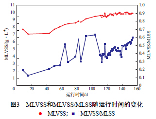 MLVSS和MLVSS/MLSS隨運(yùn)行時(shí)間的變化見(jiàn)圖3。由圖3可見(jiàn):在馴化期內(nèi),由于廢水中的DMSO對(duì)菌種有抑制作用,MLVSS逐漸減小;隨著活性污泥對(duì)廢水的逐漸適應(yīng),在正式期內(nèi)MLVSS隨運(yùn)行時(shí)間的延長(zhǎng)而逐漸增大;MLVSS/MLSS也是經(jīng)過(guò)馴化期的短暫降低后,在正式期隨運(yùn)行時(shí)間的延長(zhǎng)而逐漸增大,運(yùn)行到第110天時(shí)(包括30 d馴化期)基本穩(wěn)定在0.89,說(shuō)明污泥活性較高。