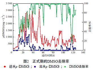 在正式期的第11天~第54天,持續(xù)的進(jìn)水DMSO高負(fù)荷對(duì)模試裝置的運(yùn)行形成沖擊,當(dāng)DMSO處于高負(fù)荷狀態(tài)時(shí)DMSO的去除效果見(jiàn)表3。