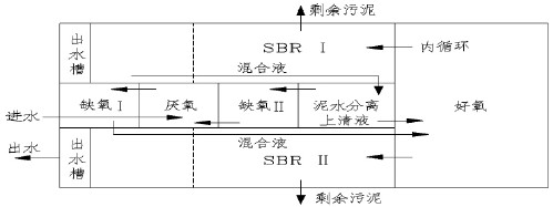 運行過程中,污水首先進入厭氧池,與來自泥水分離池、并經缺氧池Ⅱ反硝化后的混合液混合,使聚磷菌在此充分釋磷,然后進入缺氧池Ⅰ繼續進行反硝化。反硝化后的混合液進入好氧池,完成有機物去除、硝化和聚磷菌的攝磷等功能,比較后混合液進入SBR 池Ⅰ或SBR 池Ⅱ,在此進行比較后的處理及泥水分離,并排出澄清出水(如圖2 所示) 。除兩個SBR 池外,工藝中其余各池均處于恒水位、連續運行的狀態,其運行操作方式基本固定。而對SBR 池而言,當其中一個SBR 池作為比較后處理工段時,另一個SBR 池則在1.5Q 的回流量(至泥水分離池) 的條件下以硝化、反硝化的模式運行或進行靜止預沉淀。運行期間始終進行污泥回流,并首先進入泥水分離池分離濃縮,上清液進入好氧池,濃縮污泥進入缺氧池Ⅱ,進行反硝化,并消耗掉污泥中DO 和硝酸鹽,為隨后在厭氧池中的釋磷過程創造有利條件。