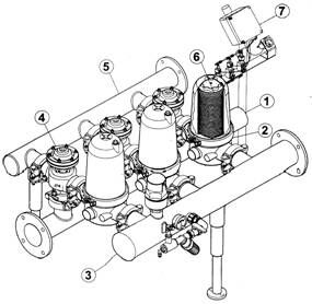 過濾系統由六個模塊化的過濾單元組合而成,由共同的進水口、出水口及排污口連接在一起。過濾器主要包括下列組件: